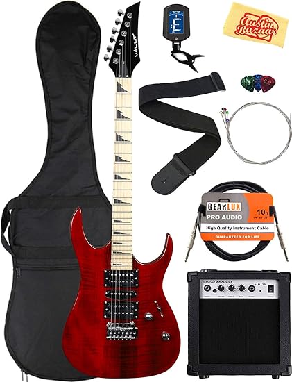 - Amazon Com Vault Electric Guitar Bundle With Amplifier Gig Bag Instrument Cable Strap Tuner Strings Picks And Austin Bazaar Polishing Cloth Transparent Red Musical Instruments